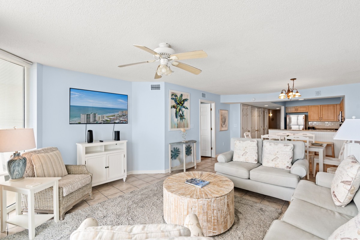 The three bedroom, three bath luxury vacation rental comfortably accommodates families, golfers and several couples vacationing together. The interior hues of this North Myrtle Beach condo compliment the ocean that can be seen from several vantage points within the Ashworth 1304 vacation rental. Open the balcony door and a coastal breeze blows through the living room, dining area and into the kitchen of this condo rental.
