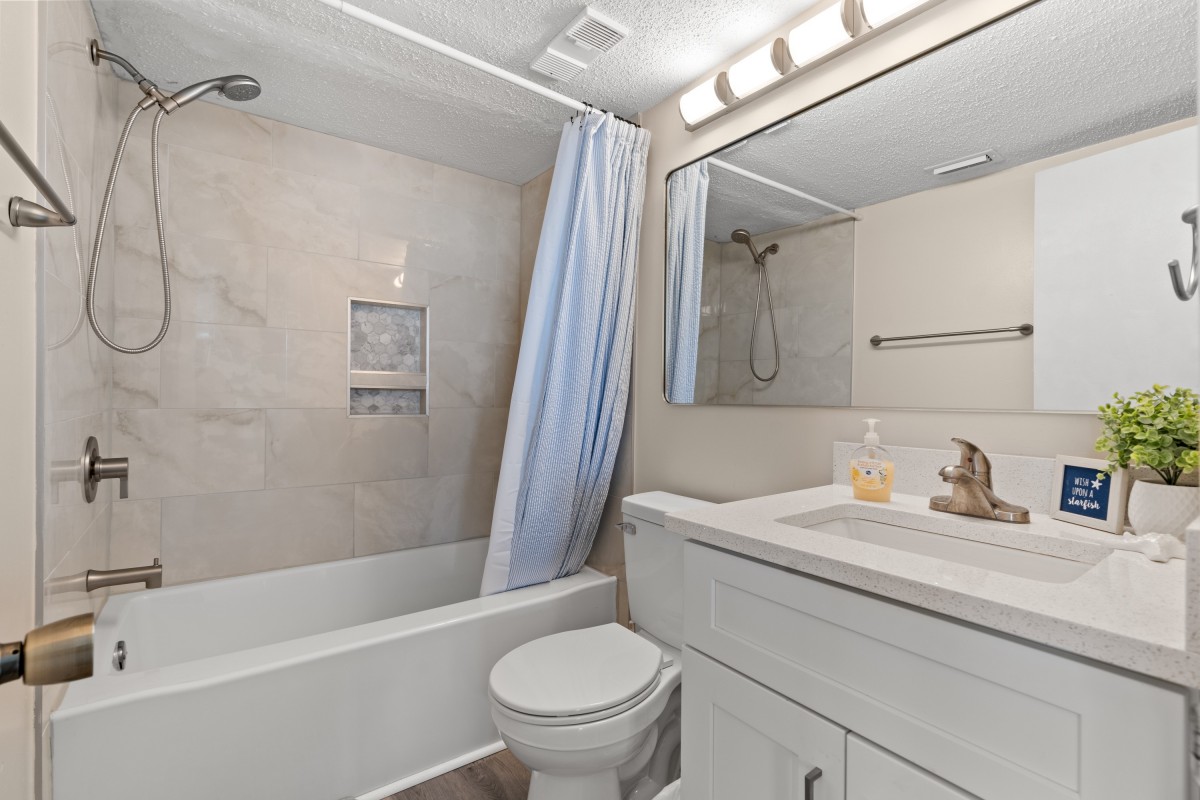 This rental has a private balcony that is furnished and enclosed. You can sit and enjoy the outdoors without being bothered by pests such as flies or mosquitos. Below, you can see the sparkling swimming pool. Prepare meals, large and small, in the equipped kitchen. This kitchen has everything you need including cookware, a coffeemaker, and a dishwasher. The dining table is next to the breakfast bar, which provides enough seating for everyone without feeling cramped. The living room is comfortably furnished and features a large flatscreen TV. Find entertainment with three flatscreen TVs and complimentary WIFI. Central heating and air conditioning will keep the condo cool, even when it’s hot or humid outside. One of the bathrooms has a walk-in shower.