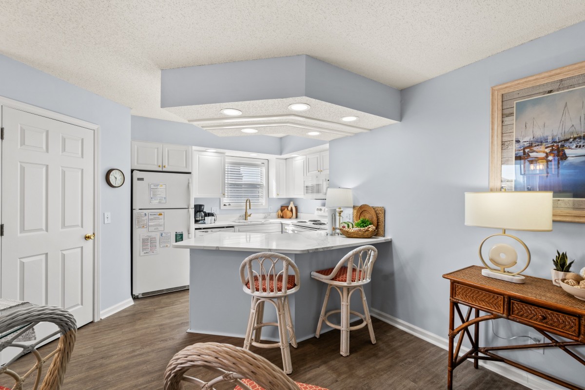 Six people really will fit beautifully in this North Myrtle Beach, SC beach vacation rental condo and resort. Shore Haven II 6A is a two-bedroom, two-bath North Myrtle Beach, SC beach vacation rental condo that accommodates six. The dining table in this North Myrtle Beach, SC beach vacation rental condo even seats six people. The spacious living room in this North Myrtle Beach,