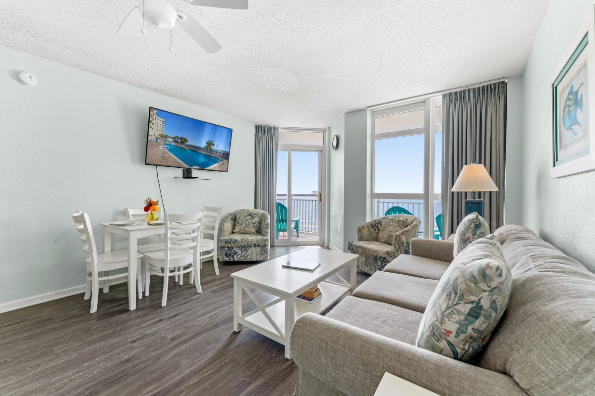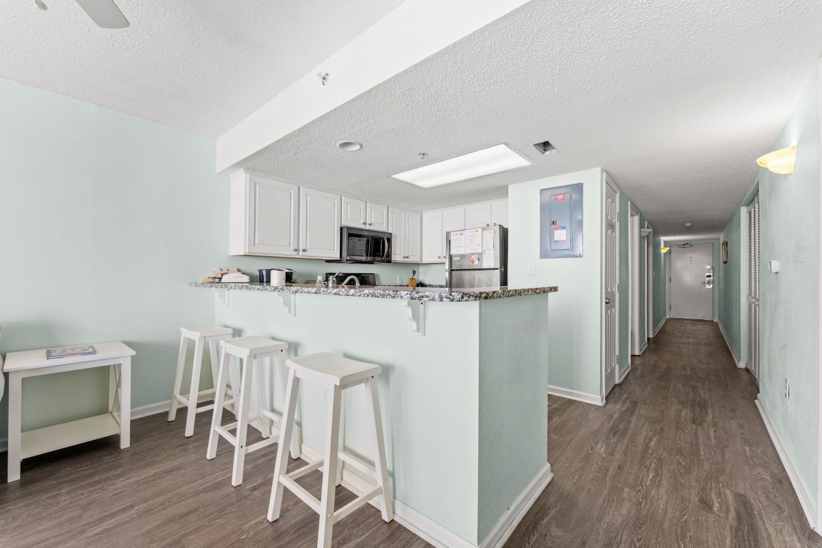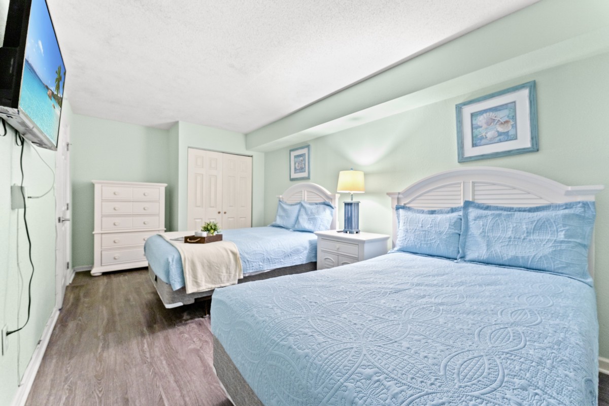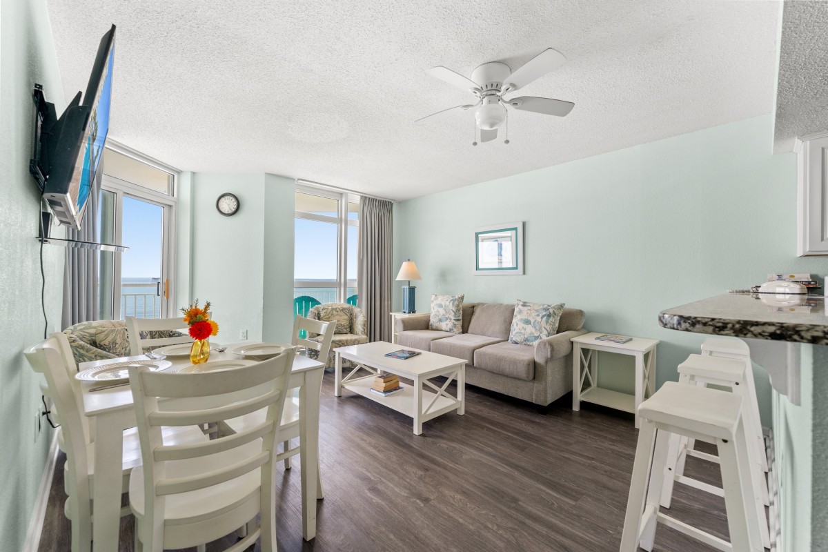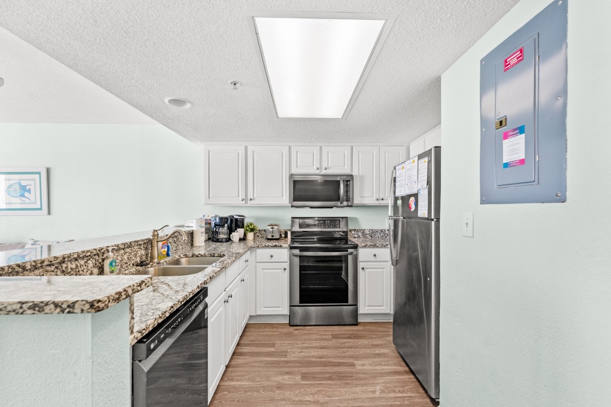 The kitchen boasts a dishwasher and plenty of room for you to make a quick breakfast or at least a fresh pot of coffee to be enjoyed on the oceanfront balcony. The view, the breeze and the salt-scented air are a relaxing combination to be enjoyed in the comfort of your oceanfront condominium. This North Myrtle Beach, South Carolina vacation rental even features a washing machine and clothes dryer for your use during this North Myrtle Beach vacation.