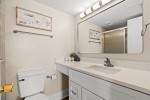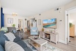 This rental has a private balcony that is furnished and enclosed. You can sit and enjoy the outdoors without being bothered by pests such as flies or mosquitos. Below, you can see the sparkling swimming pool. Prepare meals, large and small, in the equipped kitchen. This kitchen has everything you need including cookware, a coffeemaker, and a dishwasher. The dining table is next to the breakfast bar, which provides enough seating for everyone without feeling cramped. The living room is comfortably furnished and features a large flatscreen TV. Find entertainment with three flatscreen TVs and complimentary WIFI. Central heating and air conditioning will keep the condo cool, even when it’s hot or humid outside. One of the bathrooms has a walk-in shower.